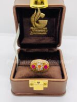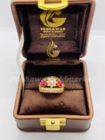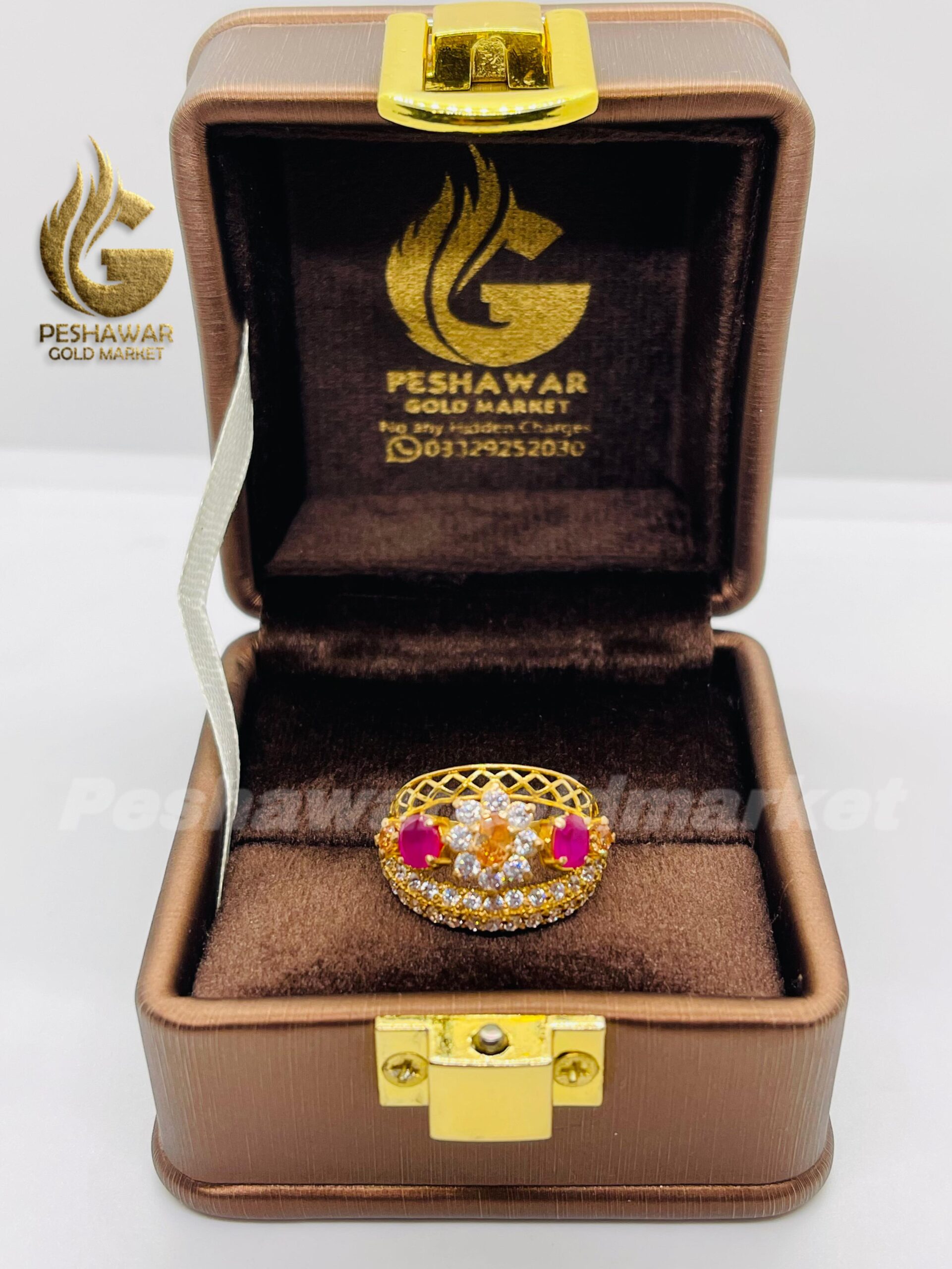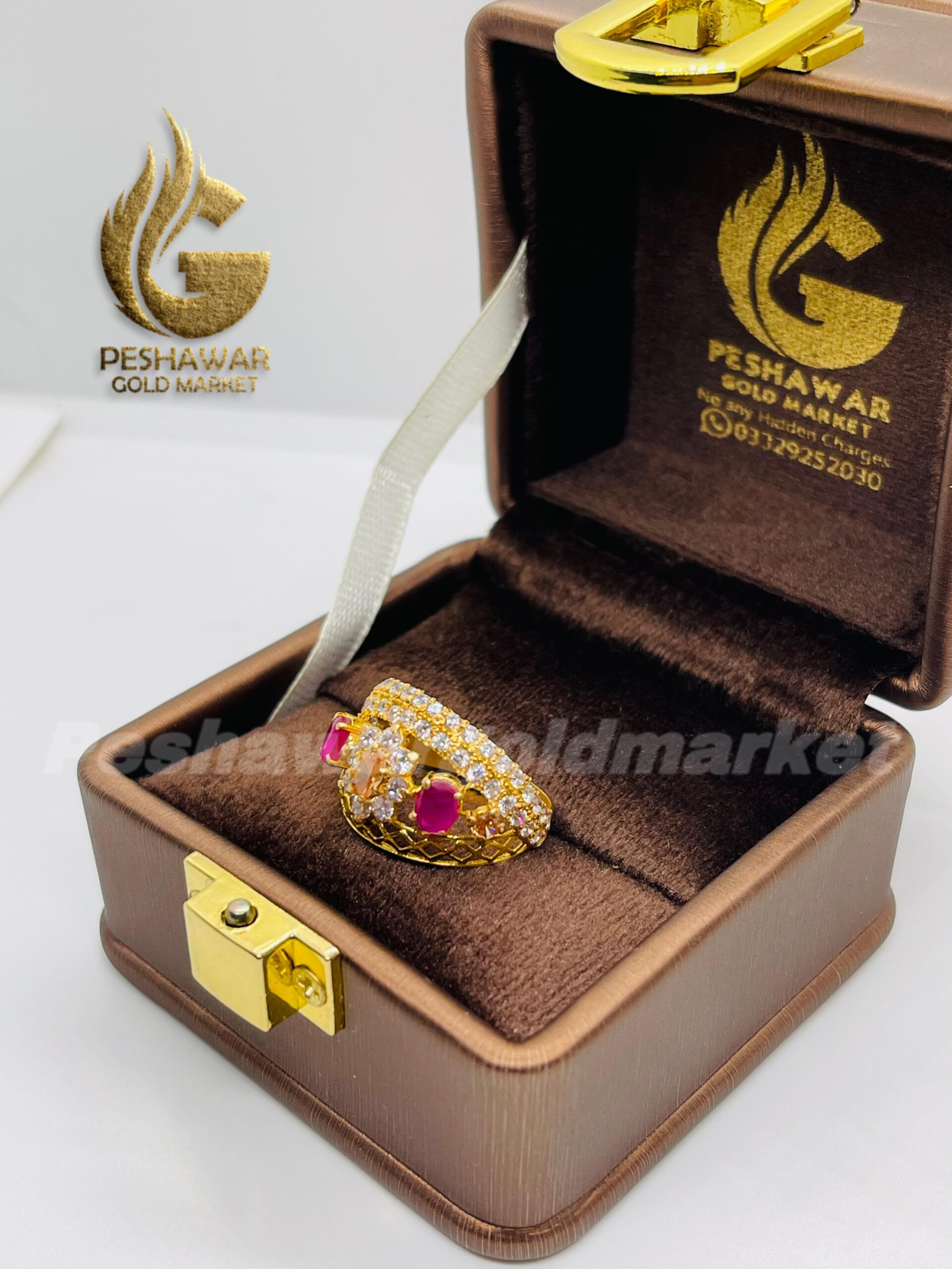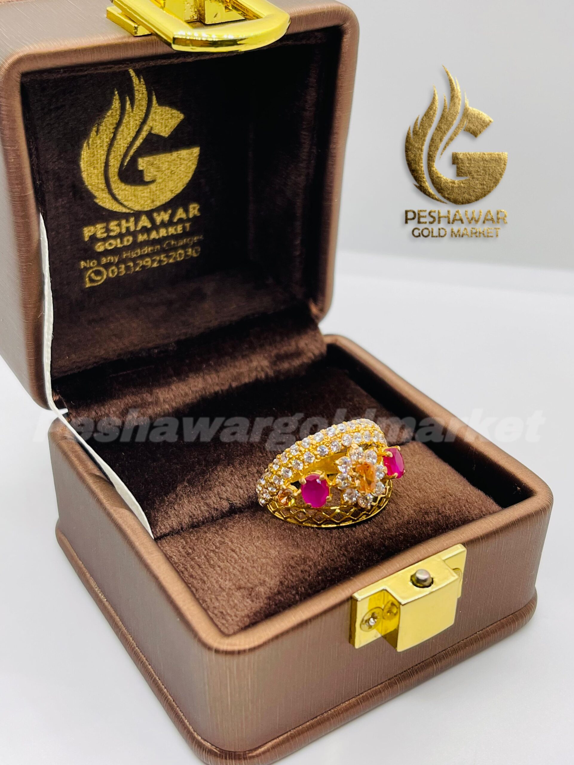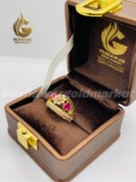 1. This exquisite gold ring, weighing 4 grams, features a stunning pink zircon stone that radiates elegance and charm. Nestled in a sophisticated brown box, it makes for a perfect gift or a luxurious addition to your jewelry collection. The original zircon stones enhance its allure, making it a timeless piece for any occasion.