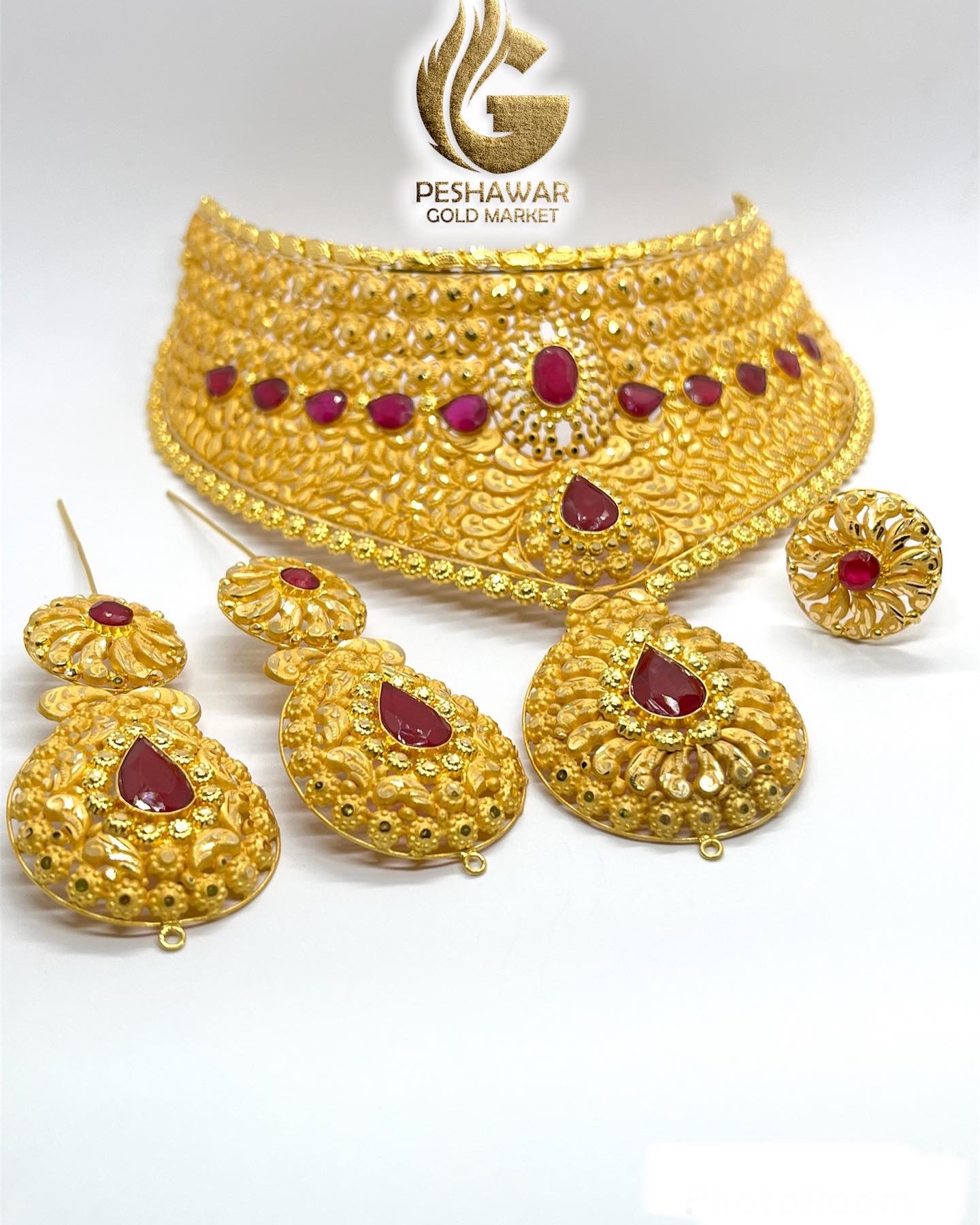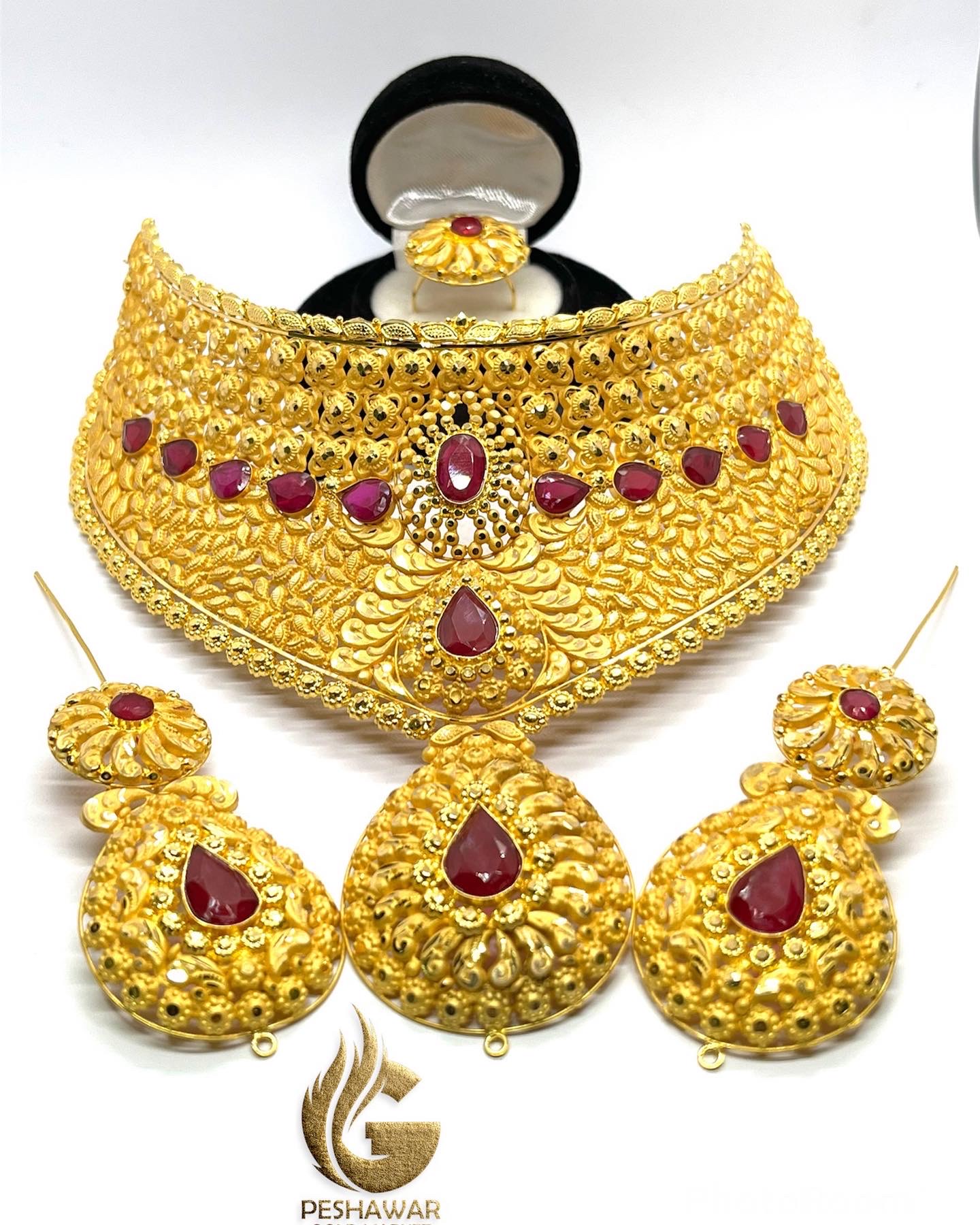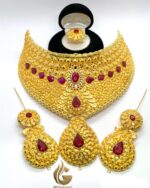 1. Enhance your bridal look with this exquisite gold necklace and earrings set adorned with stunning red stones. This trending Madrasi bridal set exudes elegance and sophistication, making it the perfect choice for your special day. Make a statement with this timeless and luxurious jewelry set that will surely turn heads and leave a lasting impression.